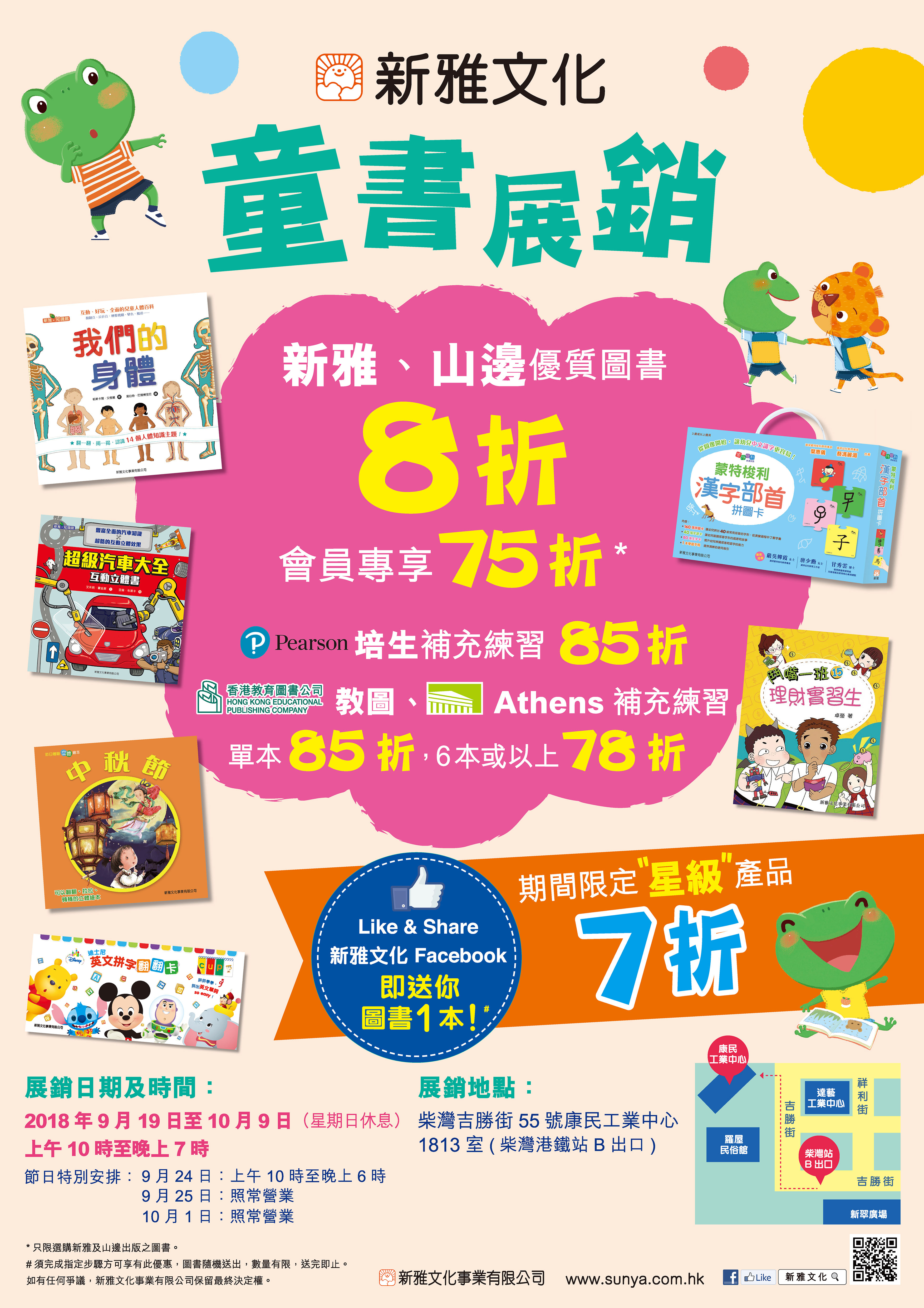 新雅文化 Sun Ya Publications「童書展銷」又來啦~!今次來到港島區的 柴灣康民工業中心 舉辦,場內展出各類優質兒童圖書、教育玩具、中英文補充練習等,更一律以優惠價發售呢!