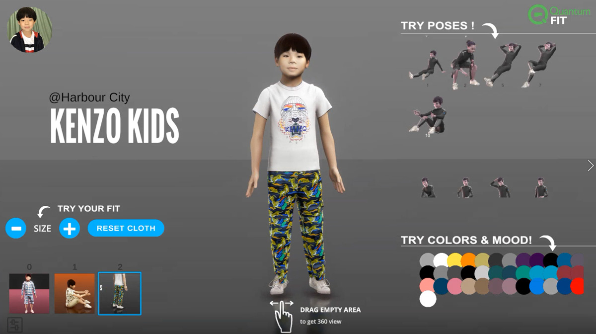 小朋友只要在活動期間前往海運大廈地下中庭,即可免費製作擁有個人頭像及身型的數碼立體人型,以「真身」即時體驗!實時虛擬試衫系統 —QFit,讓小朋友即場360度「試穿」今季最新童裝系列,同時「感受」衣物的質料。只要於場內輸入身高、體重等簡單資料,對準鏡頭拍照,仿真度極高的數碼立體人型便瞬間顯示於場內的屏幕上。